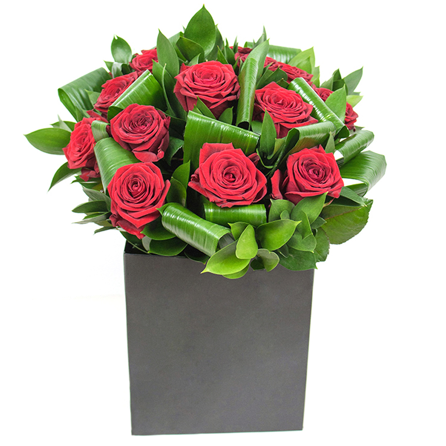 Enhance any space with our Sophisticated Red Roses Floral Arrangement. This elegant bouquet features rich red roses combined with fresh aspidistra leaves and lush ruscus, creating a stunning and unique display.